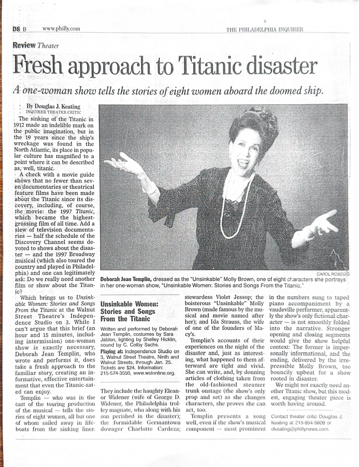 The Titanic production inspired Templin to create her solo show UNSINKABLE WOMEN: Stories and Songs from the Titanic. Having successfully toured the country with UNSINKABLE WOMEN, Templin created her autobiographical play, SINGING FOR THE COWS. These solo shows have played more than 150 venues, including the New York’s Lincoln Center Performing Arts Library Series.